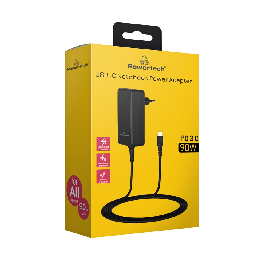Φορτιστής τοίχου της Powertech για την φόρτιση laptop μέσω θύρας USB-C. Υποστηρίζει πρωτόκολλο γρήγορης φόρτισης PD 3.0 με μέγιστη απόδοση έως 90W.