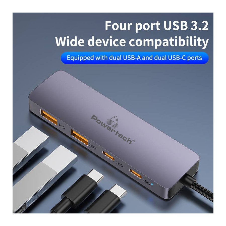 Το USB hub της Powertech επεκτείνει τις θύρες του desktop ή laptop σας με 2x USB και 2x USB-C θύρες. Συνδέεται μέσω θύρας USB-C επιτρέποντας σας να συνδέσετε οποιαδήποτε συσκευή διαθέτει έξοδο USB, όπως σκληρούς δίσκους, ποντίκι, πληκτρολόγιο, web κάμερα, card reader κ.α.