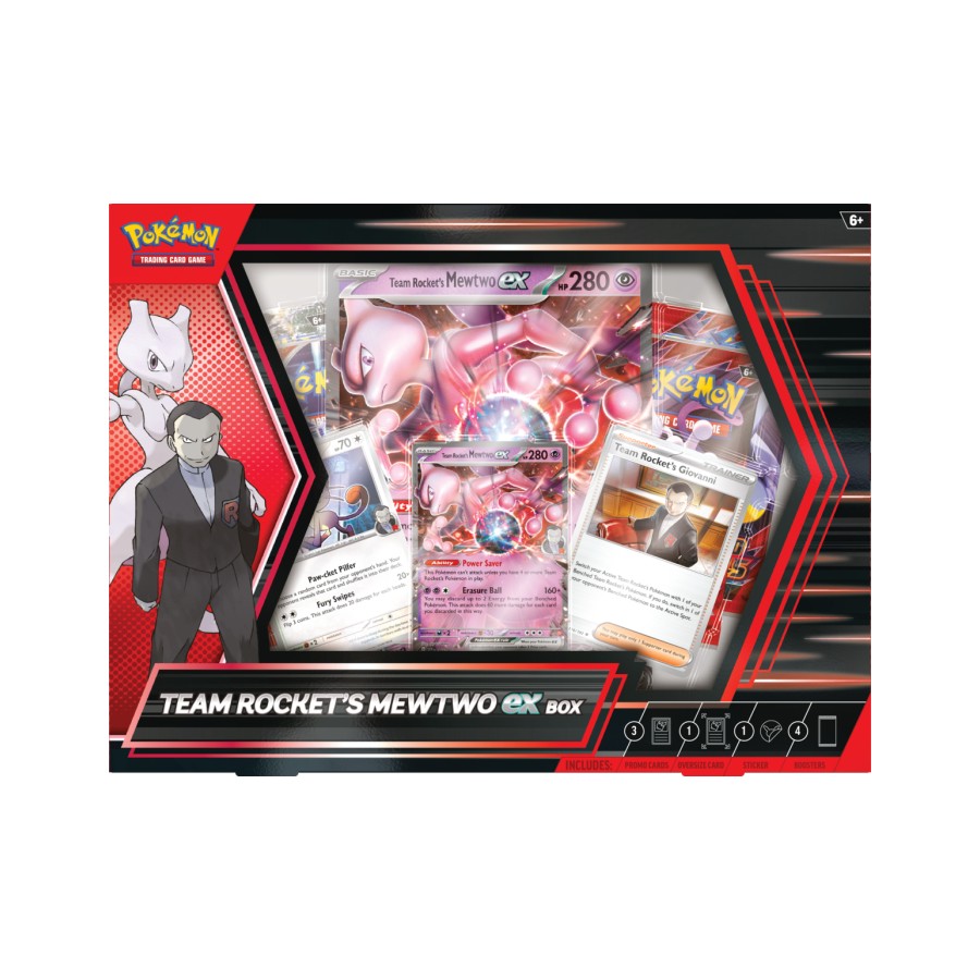 The Pokémon TCG: Team Rocket’s Mewtwo ex Box includes: