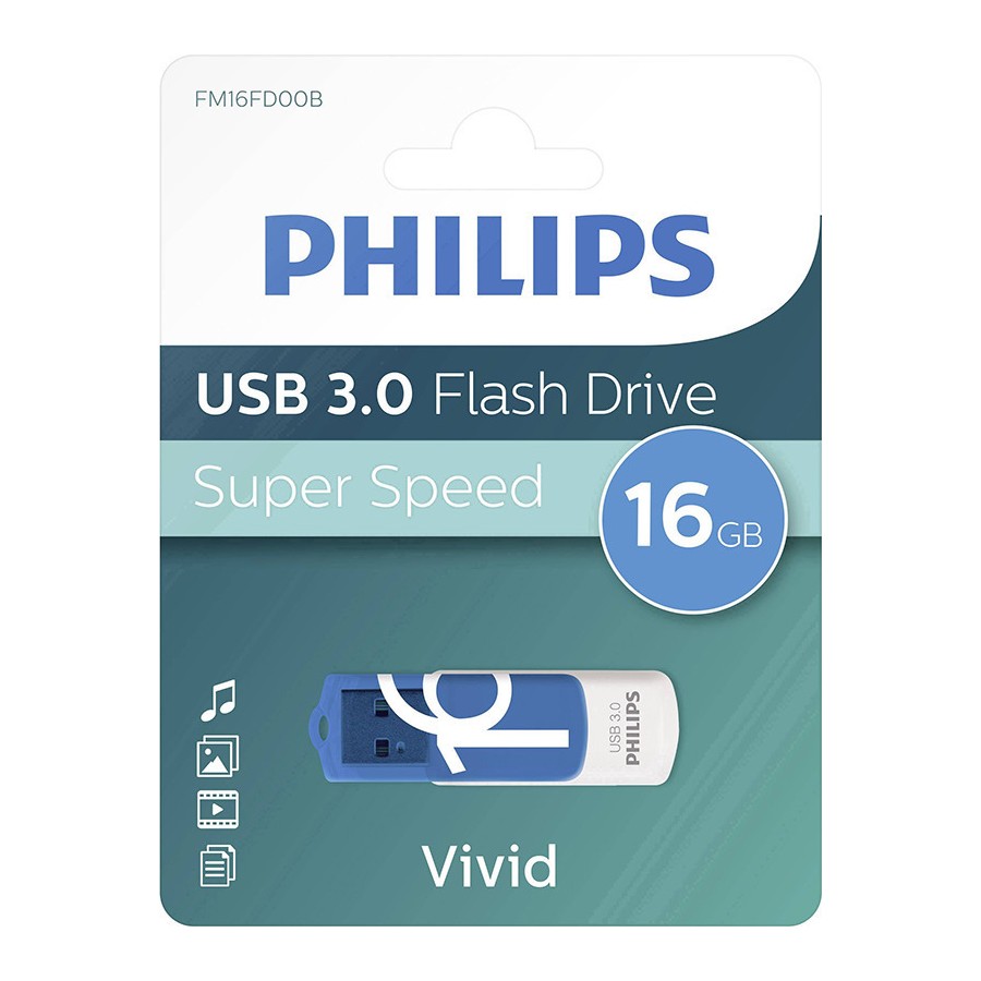 USB Stick της εταιρίας Philips που διαθέτει χωρητικότητα 16GB. Υποθέτοντας ότι το μέσο μέγεθος για μια φωτογραφία, ένα MP3 και ένα Video είναι 2MB, 4MB και 500MB αντίστοιχα, τότε το μέγεθος αυτού του USB μπορεί να αποθηκεύσει περίπου έως 7.500 φωτογραφίες, ή 4.000 MP3 ή 30 Video.